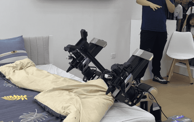 比如星海图此次展示的拉被子演示。视频虽然有加速,但是能够把被角收起的情况下机器人自主推理找到被角拉开,且多次随机重复下都能成功,也是很精彩的演示。