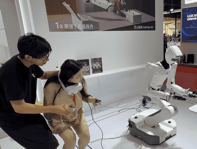 笔者也在展台体验了星尘智能的数据采集工具。展台人员介绍,他们采用绳驱传动、极度丝滑的硬件结构,才能采集出更「干净」的数据,进而训练出动作同样丝滑的模型。